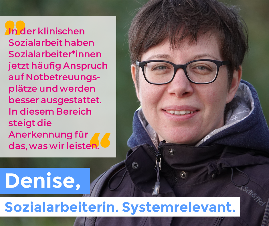 „Für die Sozialarbeit im Krankenhaussektor kann festgestellt werden, dass intern und extern zum Teil eine hohe Wertschätzung und Solidarisierung wahrnehmbar ist. Intern werden wir in einigen Häusern stärker als Teil des Behandler*innenteams wahrgenommen und extern von Patient*innen und deren Bezugspersonen oftmals stärker als sonst als Unterstützung und Stütze gesehen. Gerade auch in Folge des Besuchsverbots […]